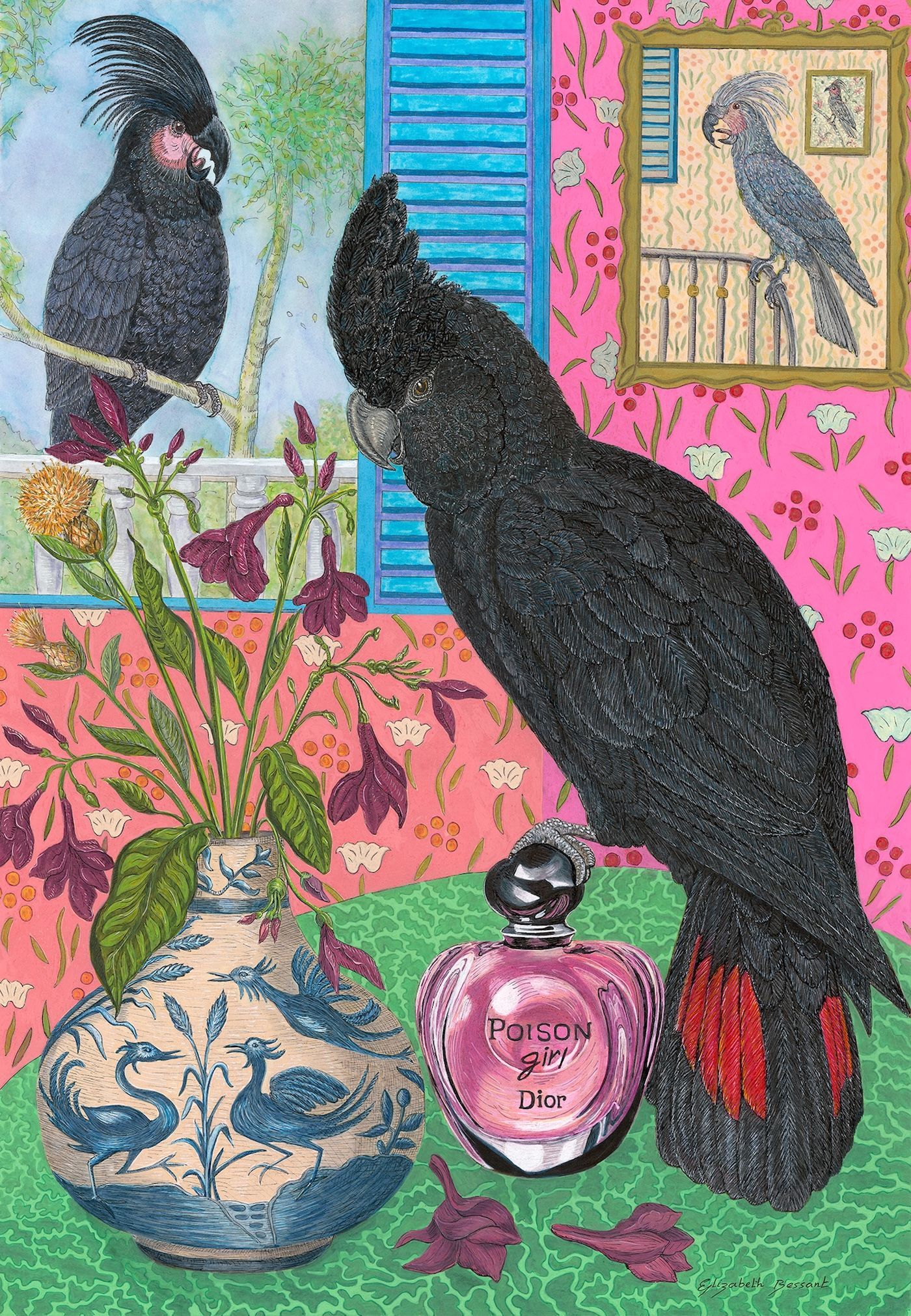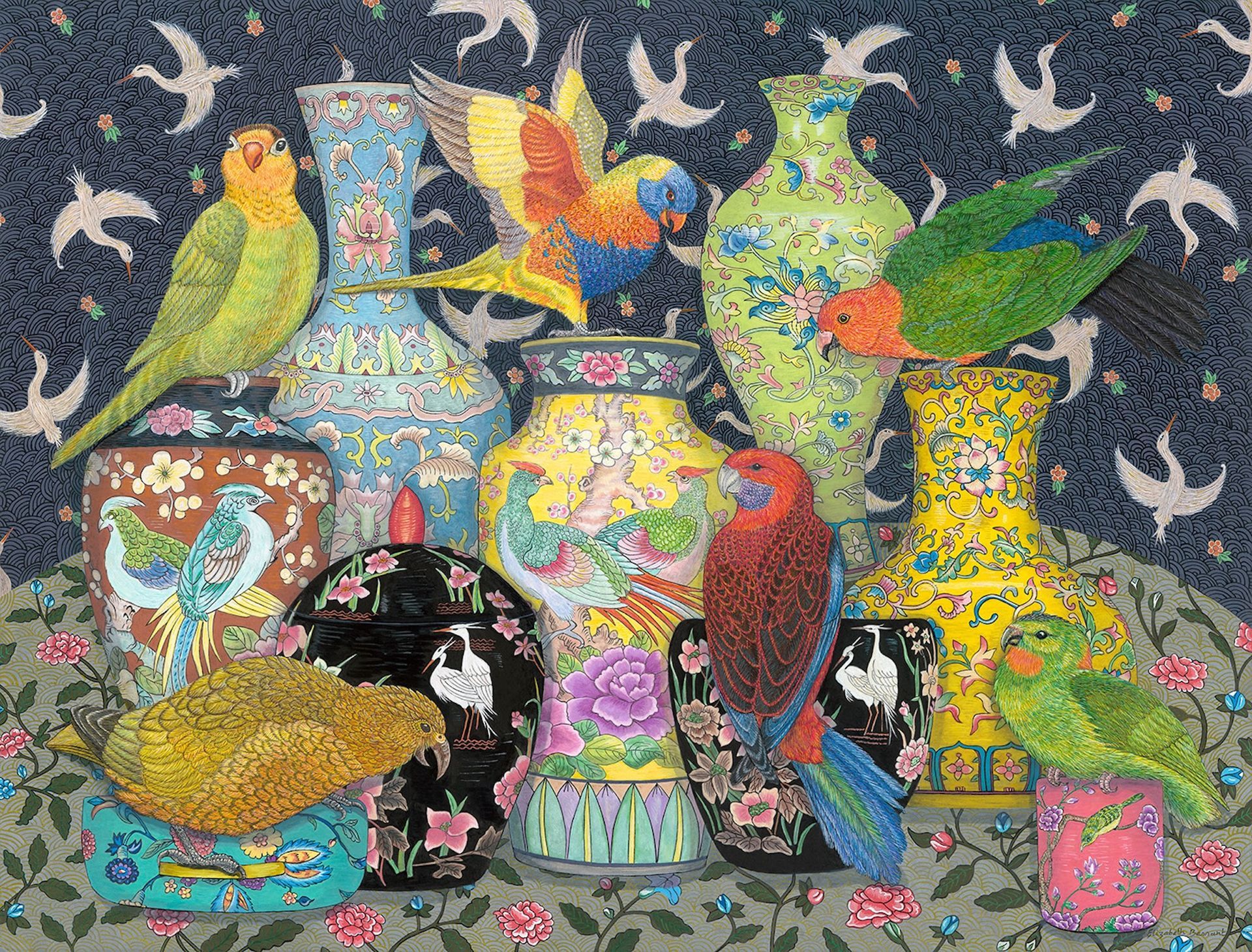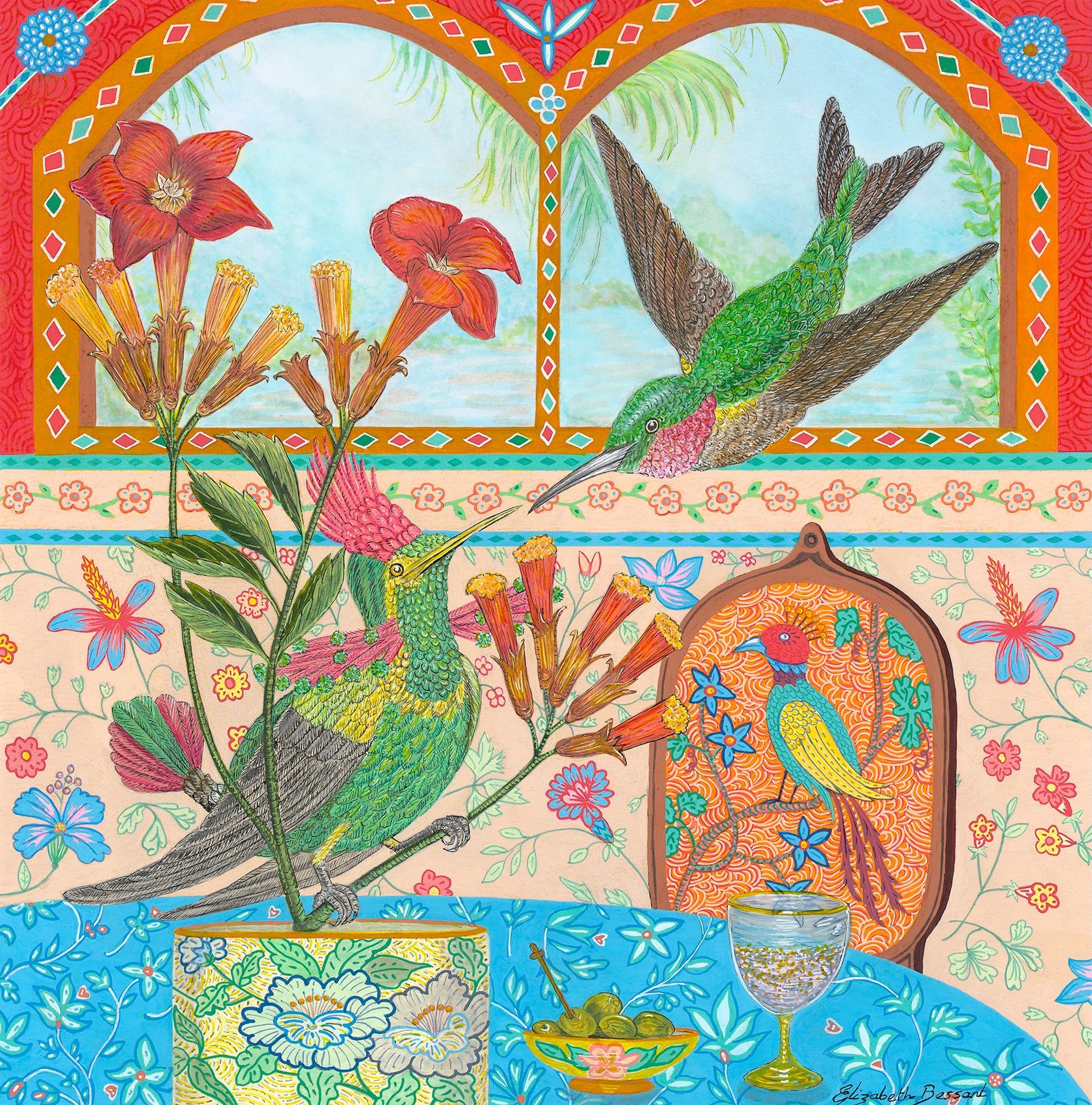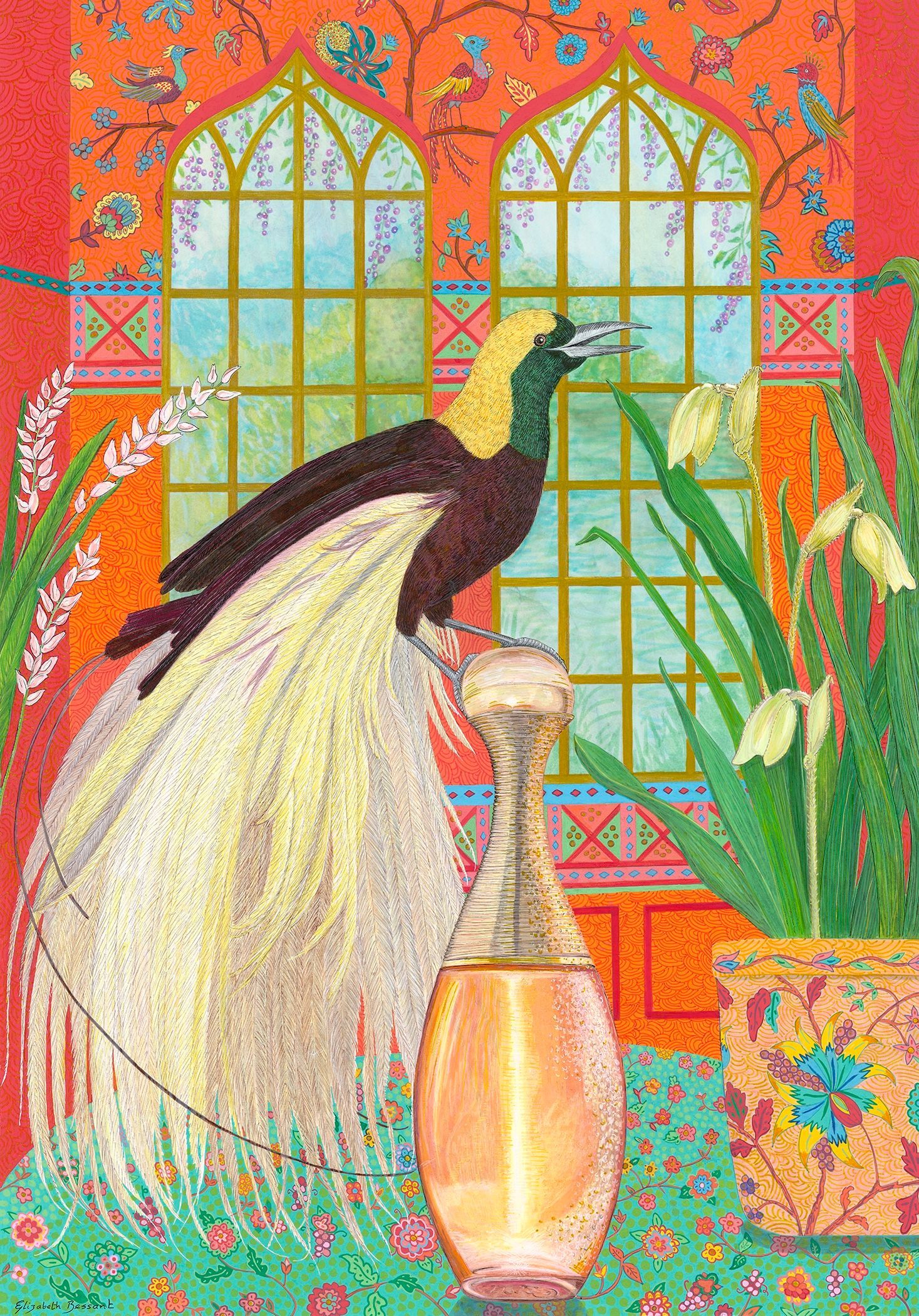 Elizabeth's meticulous process begins with in-depth research. She then sketches a composition, refining it until she's completely satisfied. To create the soft backgrounds, she employs delicate ink washes. The intricate details are then brought to life with acrylic paint and fine-line pens. To add a touch of opulence, she highlights each painting with metallic gold or silver.