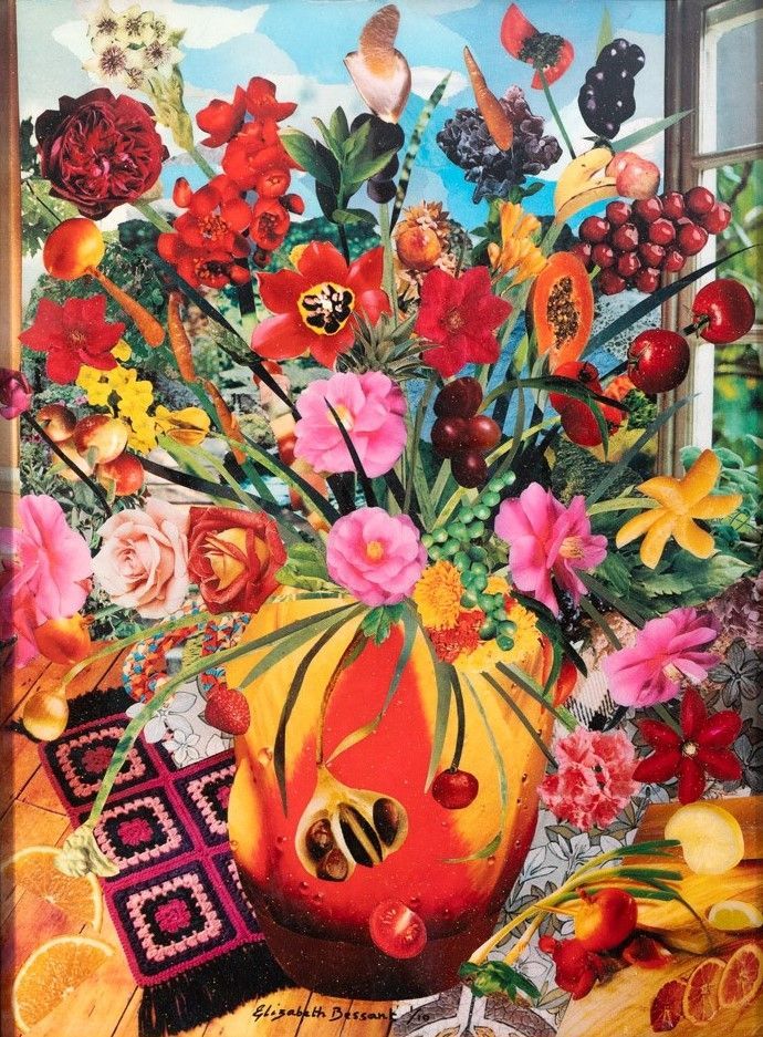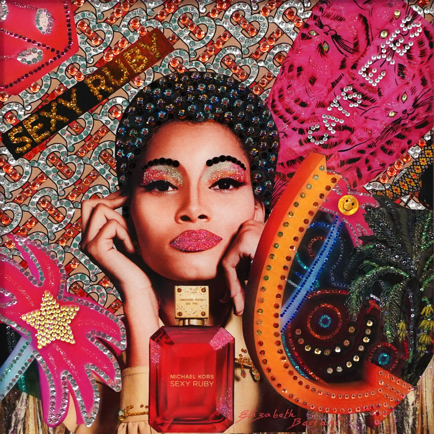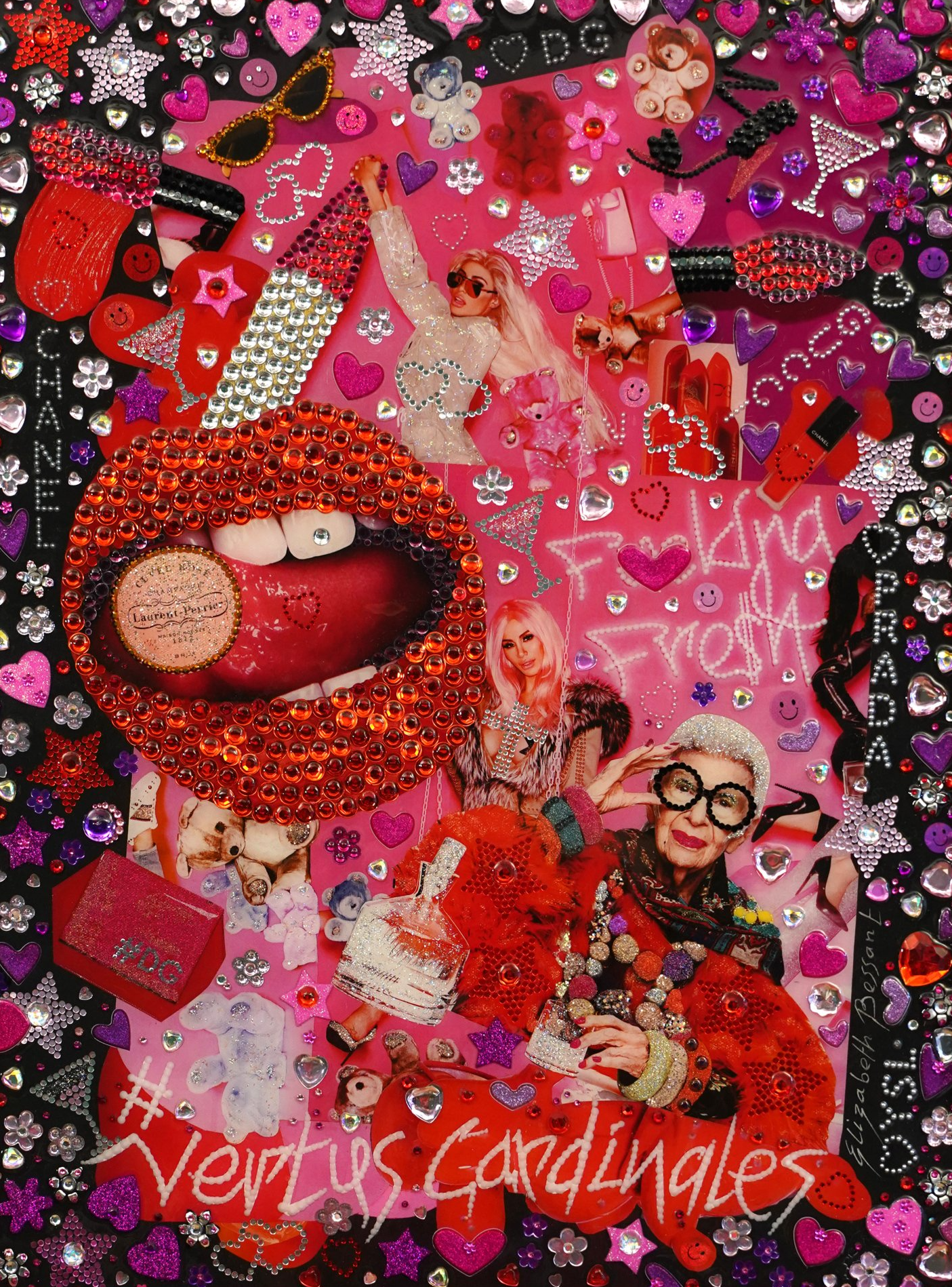 Using materials from glossy magazines, Elizabeth Bessant critiques the influence of fashion and luxury brands while celebrating their visual impact through vibrant embellishments and a high-gloss finish.